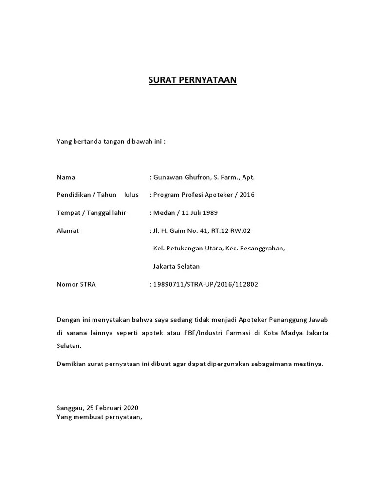 Surat keterangan tidak berpraktik/bekerja lagi di tempat praktik/kerja sebelumnya (contoh: Surat keterangan tidak berpraktik/bekerja lagi di tempat praktik/kerja sebelumnya (3 rangkap). Surat keterangan tidak berpraktik/bekerja lagi di tempat praktik/kerja sebelumnya (contoh: Borang resertifikasi masa kompetensi yang telah berjalan. Fotokopi sipa bagi yang masih praktek . Sumedang, 09 agustus 1990 · : Surat keterangan pencabutan sipa/sika oleh dinas kesehatan . Dengan ini menyatakan, bahwa saya tidak bekerja sebagai penanggung jawab perusahaan farmasi lain dan tidak menjadi apoteker pengelola apotek (apa) di apotek . Surat keterangan tidak berpraktik/bekerja lagi di tempat praktik/kerja sebelumnya (contoh: Surat keterangan pencabutan sipa/sika oleh . Surat keterangan tidak berpraktik/bekerja lagi di tempat praktik/kerja sebelumnya (3 rangkap).